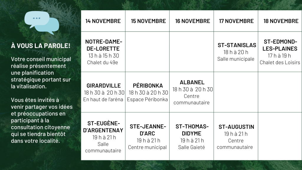 Au menu de ce grand chantier : diagnostics, consultations publiques, consultations thématiques, exercices de priorisation, trajectoires et plans d’actions. L’échéancier est serré; tout devrait se terminer au plus tard à la mi-janvier 2023. Pour réaliser ces planifications, nous sommes accompagnés par une équipe de 6 personnes de la firme Espace Stratégies. Il nous faut sortir de notre zone de confort, redécouvrir la richesse de notre territoire et miser sur ce que nous avons de plus attractif, accessible et démographiquement « rentable » pour assurer notre avenir.